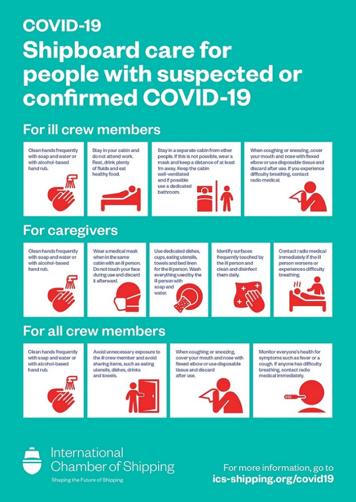 Ships should receive information and instructions about the measures introduced by the company to address the risks associated with COVID-19. Ship operators should ensure that seafarers are familiarized with their ship’s plans and procedures related to health protection during the COVID-19 pandemic, in particular those related to actions to take if any persons on board display symptoms of COVID-19 infection in order to initiate management of the potential outbreak.
