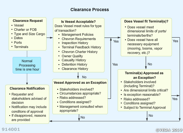 Based on the vetting inspection, a vessel is approved or disapproved for charter. The process chart below illustrates the clearance process.