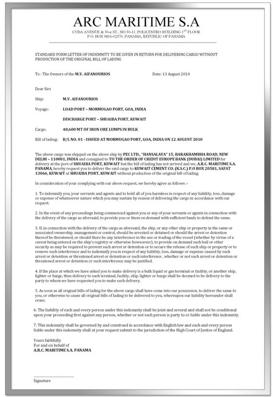 A Letter of Indemnity for the delivery of cargo without a B/L
