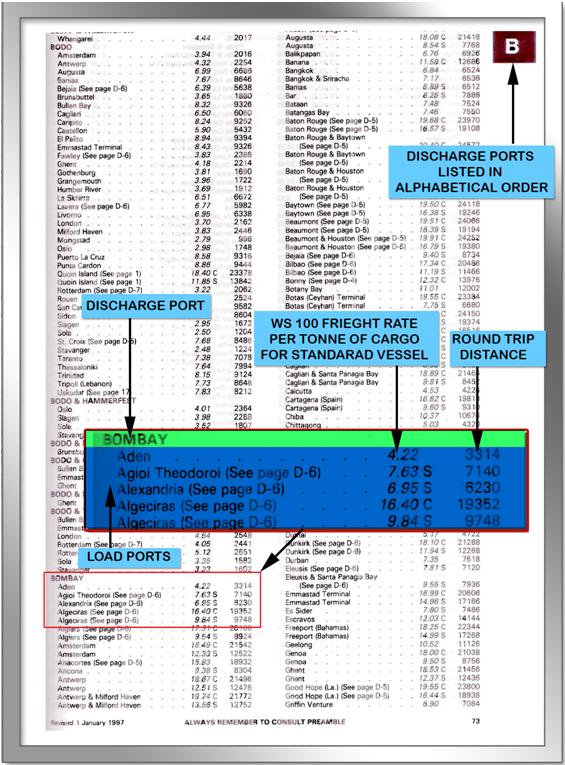 For example to find the WS100 rate from Bombay (the discharge port) to another port (say Aden), look at the page in the schedule with Bombay in bold and in capitals and then extract the rate and distance from the schedule for the round trip voyage to Aden.